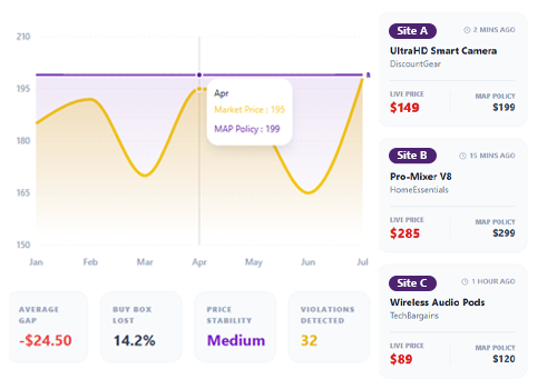 Retailers leverage Map Monitoring to Stop Price Violations Fast, generating instant alerts and actionable insights to enforce compliance and reduce the impact of unauthorized discounts.